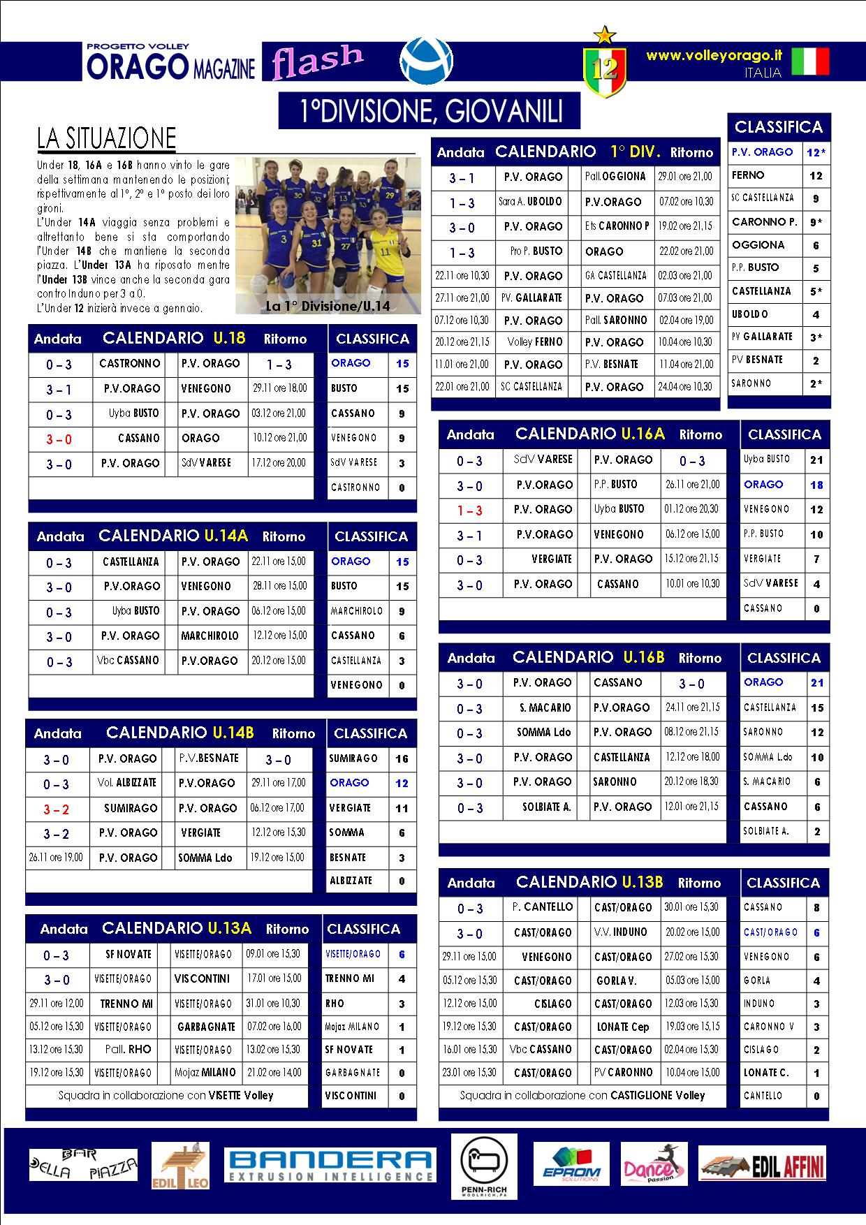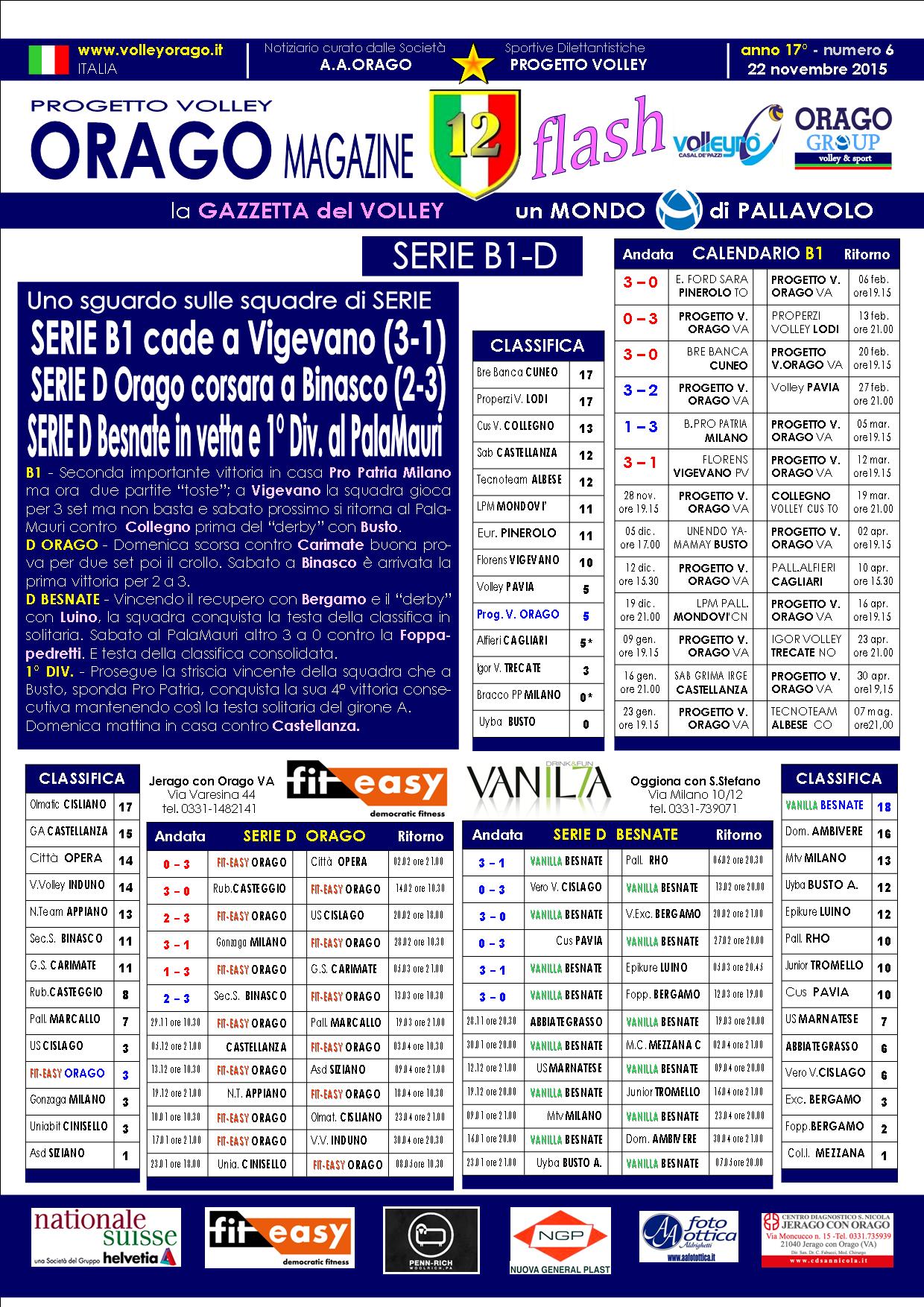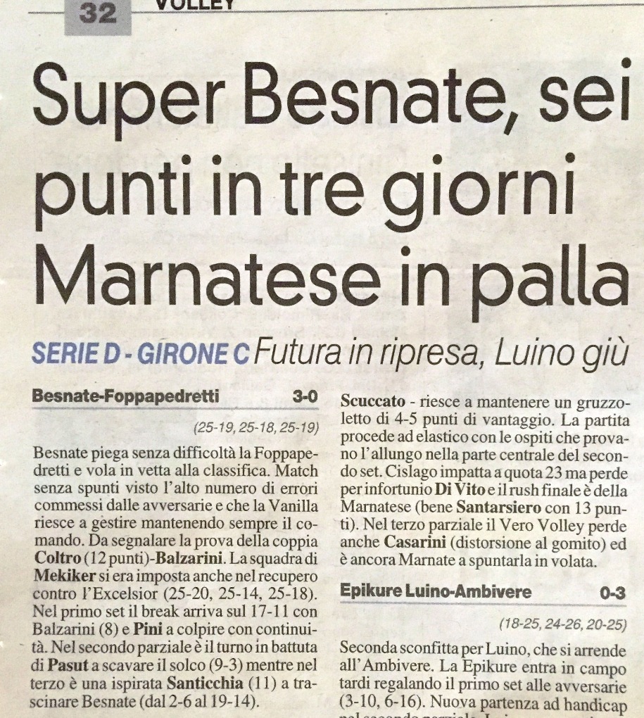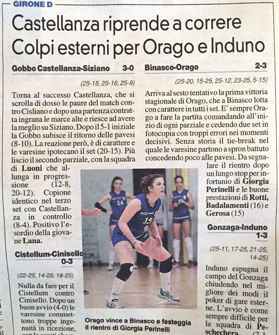 ltro fine-settimana di grandi risultati, stecca solo la Serie B1 che a Vigevano combatte, vince un set, ma poi cede sommersa dai propri errori. Finalmente arriva la prima vittoria in campionato della Serie D Orago che torna a casa dalla trasferta di Binasco con 2 punti importanti per la classifica ma soprattutto per il morale.