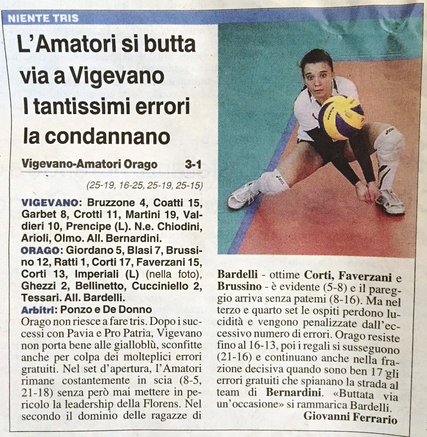 3° set: iniziamo bene con L'ace di Giordano e il muro di Faverzani, Brussino in attacco e a muro si fa sentire e siamo avanti (4-6). E' un buon momento ma non siamo capaci di sfruttarlo, anzi con tutta una serie di errori e indecisioni (Ratti in difesa, Giordano in fallo di doppia, e 3 attacchi out di Corti) permettiamo alle locali di riprendersi (9-6). Rimaniamo a contatto (10-10, 12-12) ma ancora gli errori si sussuegono, Vigevano capisce che non serve forzare e pian piano allunga (15-13, 19-16, 23-17) sino alla chiusura (25 a 19);